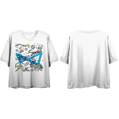 Roll around in nostalgic style when you wear this juniors’ white graphic cropped t-shirt! The big colorful image has been professionally printed and applied so it will last long enough to get you through any adventure life throws your way. Made of 100% preshrunk cotton this white Sonic the Hedgehog fan apparel features short sleeves and a cropped length for comfort and style in warmer weather. It can be machine washed with like colors then tumble dried for easy care. As an officially licensed product this Let’s Roll t-shirt makes a great gift for any Sonic fan!