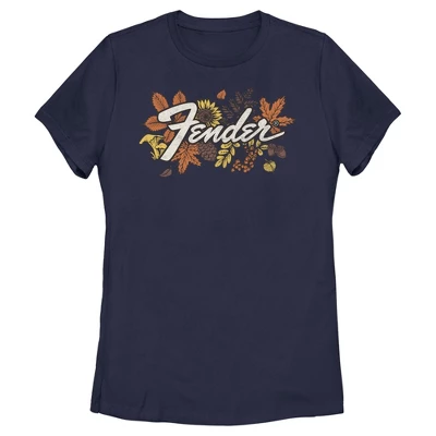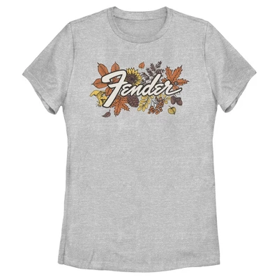 - Strut your stuff with this stylish new women’s t-shirt that is perfect for fall! Featuring the classic Fender logo surrounded by acorns, pine cones, and fall leaves in shades of orange, brown, and yellow across the front.