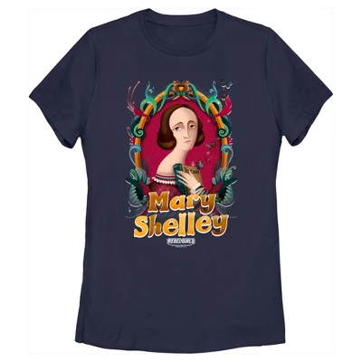 - Strut your stuff with this stylish new everyday women’s t-shirt that is perfect for every occasion! Featuring a colorful portrait of Mary Shelley framed by leaves and feathers.
